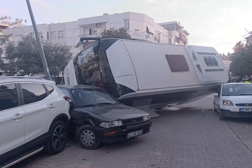 Kaza yapan otel servisi, park halindeki araçların üzerine devrildi