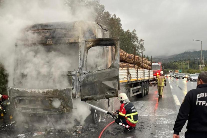 K.K. idaresindeki tomruk yüklü tır, Aydın-İzmir Otoyolu 75. Yıl Selatin Tüneli yakınlarında seyir halindeyken henüz belirlenemeyen nedenle alev aldı.